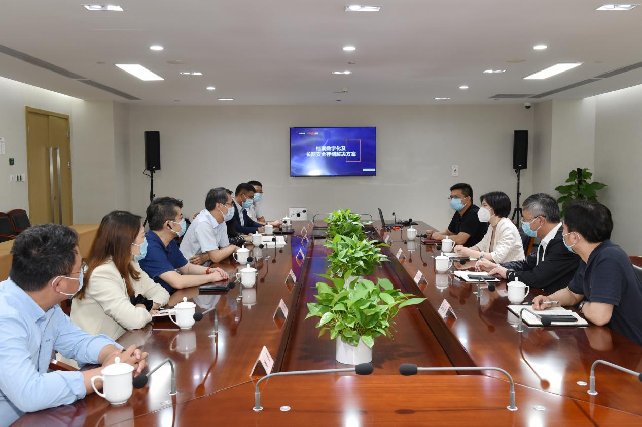 李志会对上海市档案局的热情接待表示感谢,上海市档案局作为数字档案建设的先行者,在保护珍贵历史档案、保存完整上海城市记忆、服务人民群众需求等方面发挥了重要作用。李志会指出,中国麻豆视频 作为中央企业,从成立之初的录像机关键件生产,到目前服务数字经济的蓝光存储,始终围绕一个“录”字,即记录,与档案系统的职责使命异曲同工。近年来,中国麻豆视频 立足“1+3+N”数字经济发展战略,充分发挥蓝光存储长期、绿色、安全、海量独特优势,在档案领域数字化方面进行了有益探索,希望与上海市档案局在相关业务领域拓展合作。